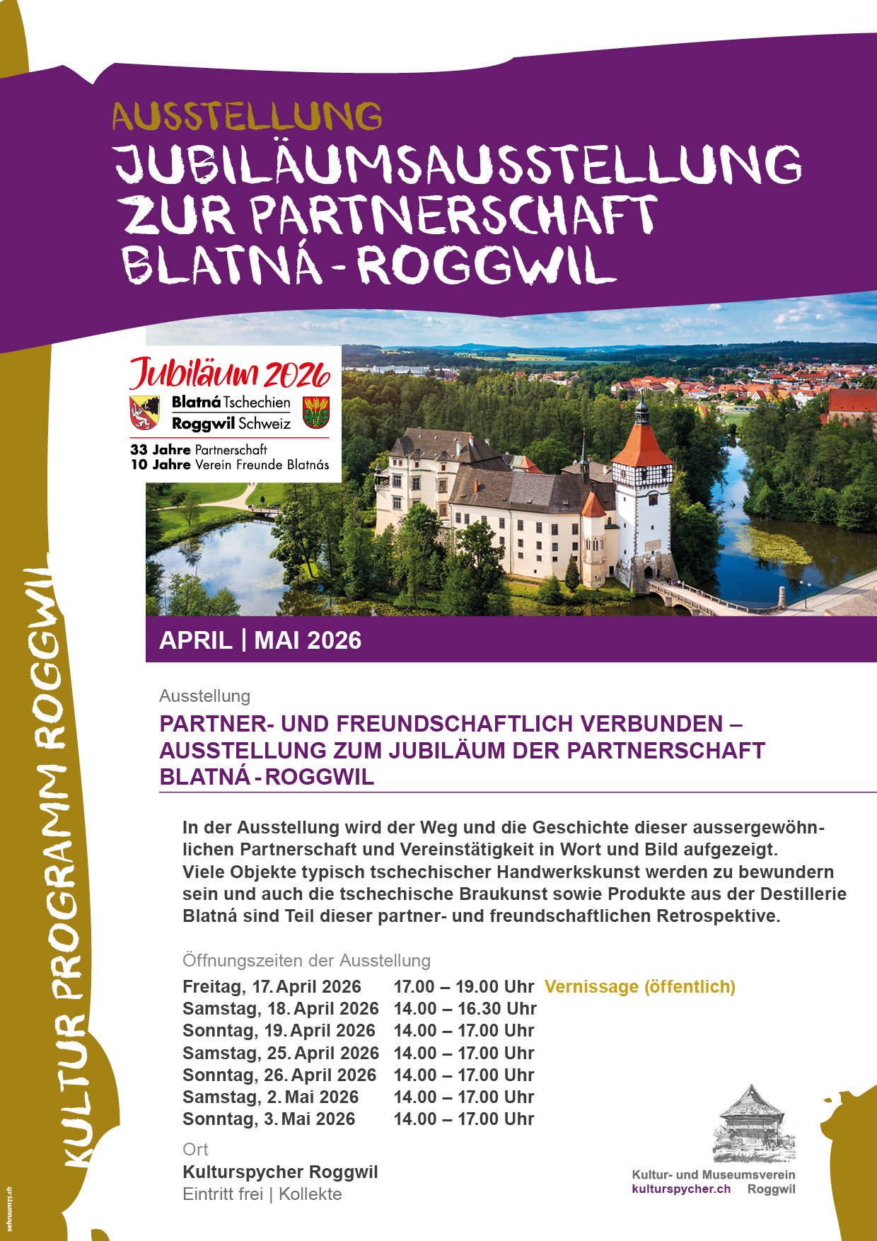 1993 wurde zwischen der Gemeinde Roggwil und der Stadt Blatná im Tschechischen Südböhmen ein Partnerschaftsvertrag abgeschlossen. Seither finden regelmässig gegenseitige Besuche statt und die Partnerschaft konnte über 33 Jahre stetig weiter ausgebaut werden. Höchste Zeit also für ein Jubiläumsfest und eine -ausstellung im Kulturspycher Roggwil!